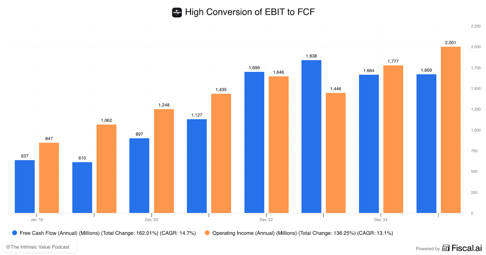 What makes this model exceptional from an investment standpoint is the cost structure. Once you own the rights to a song, you own a perpetual royalty stream with essentially zero marginal cost. Nothing needs to be manufactured, reprinted, or re-served. As a result, free cash flow conversion runs above 80% of operating profit.