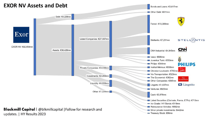 What makes this interesting from a valuation perspective is the discount. Exor's net asset value, the total value of everything it owns, net of debt, is around β¬33 billion. Exor's market cap is roughly β¬14 billion. That means you're buying the underlying assets at a ~60% discount to their market value. The Ferrari stake alone is worth nearly the entire Exor market cap. Everything else β CNH, Stellantis, Philips, stakes in the football club Juventus, the luxury fashion retailer Christian Louboutin, or the media company The Economist β you get for essentially free.