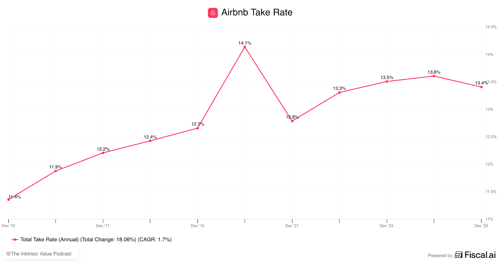 Airbnb is our second-largest position at 11.5%, and it's a company we've spent a lot of time on. The basic pitch is well-known: a pure marketplace connecting hosts and guests for alternative accommodation, with a blended take-rate of around 13-14% (about 3% for hosts and 12% for guests) on gross booking value and strong network effects.