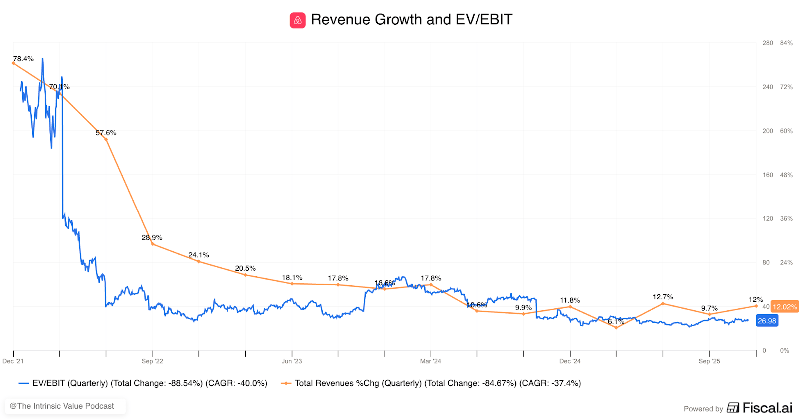 Looking at how the fundamentals have performed since IPO in 2020, the first question that comes to mind is why the stock hasnβt done anything since then. And, as so often, the answer is valuation. At IPO, Airbnb was trading at a P/OCF multiple in the low hundreds. Since then, the multiple has come all the way down to the high-teens to low-twenties, which is where it sits today. So the stock mainly didn't go anywhere because it was starting from an unreasonable place.