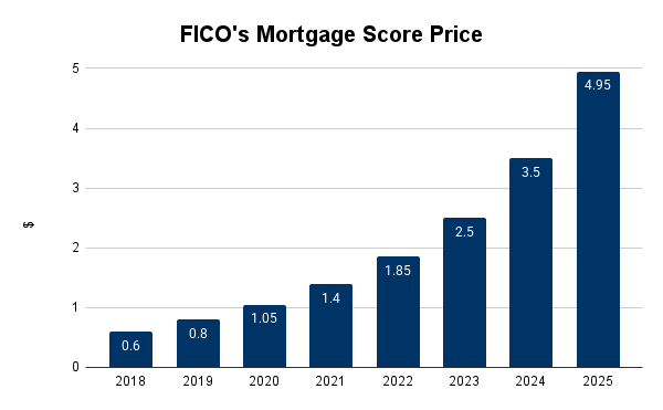 FICO is the other watchlist name many of you have been asking about recently. FICO is obviously an exceptional business β a near-monopoly in credit scoring that has been raising prices aggressively for close to a decade without losing meaningful volume. Getting a FICO score cost $0.60 in 2018. By 2025, it cost around $5. The most recent increase took it to $10. With these price hikes and almost no additional cost to produce the score, itβs not surprising that operating margins are extraordinary.