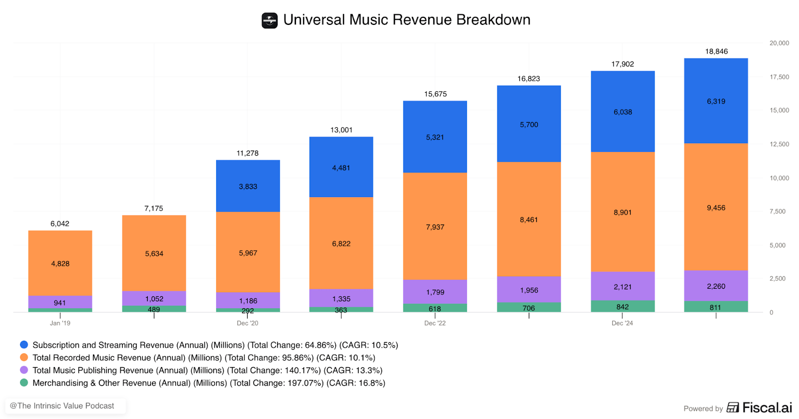 The business model is essentially a perpetual royalty stream. Every time one of UMG's songs gets streamed on Spotify, featured in a Netflix scene, used in a commercial, or licensed for a film soundtrack, Universal gets paid.
