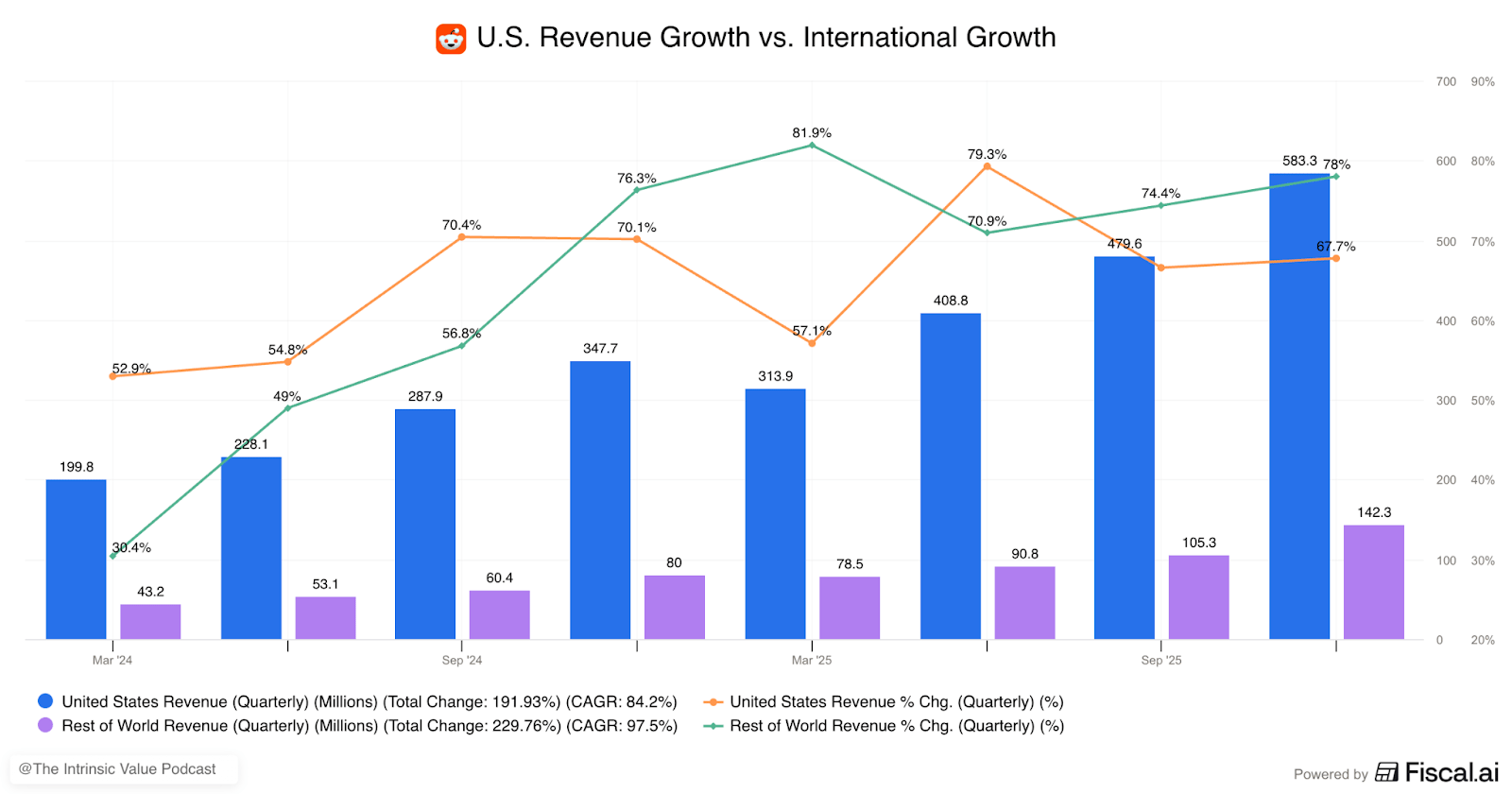 International expansion is another part of the growth story. Reddit is still overwhelmingly a US-centric platform, with nearly 70% of revenue coming from just five English-speaking markets. But international users are growing three times faster than US users. The gap in average revenue per user is still enormous β a US user is worth roughly $11 to Reddit, an international user about $2.30 β but closing even a fraction of that gap would add meaningful revenue at high margins.
