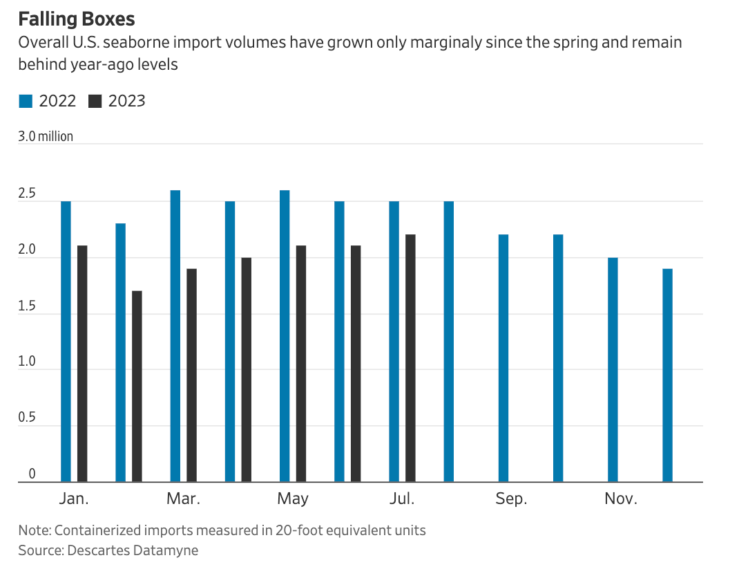 By the numbers: The volume of goods arriving at U.S. ports, which travel through trucking and rail systems to reach distribution centers and retail locations, has been underwhelming compared to 2022 levels.