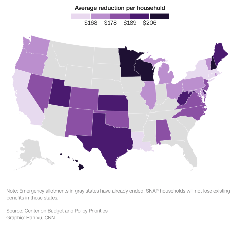 Beginning in March, households in 32 states lost at least $95 in monthly food aid. Average statewide losses range between $151 and $214 per month: