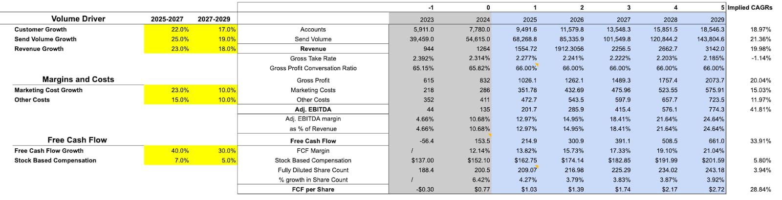 Starting with the DCF, Iβve modeled revenue growth in the mid-20s over the next two years, driven by continued strength in both customer acquisition and send volume. After that, growth tapers slightly but remains in the high teens for the following years.