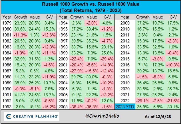 This year, growth stocks have outperformed value stocks by ~30%, the second-biggest outperformance since the data began in 1979. The only other bigger year for growth vs. value? You guessed it: 2020.