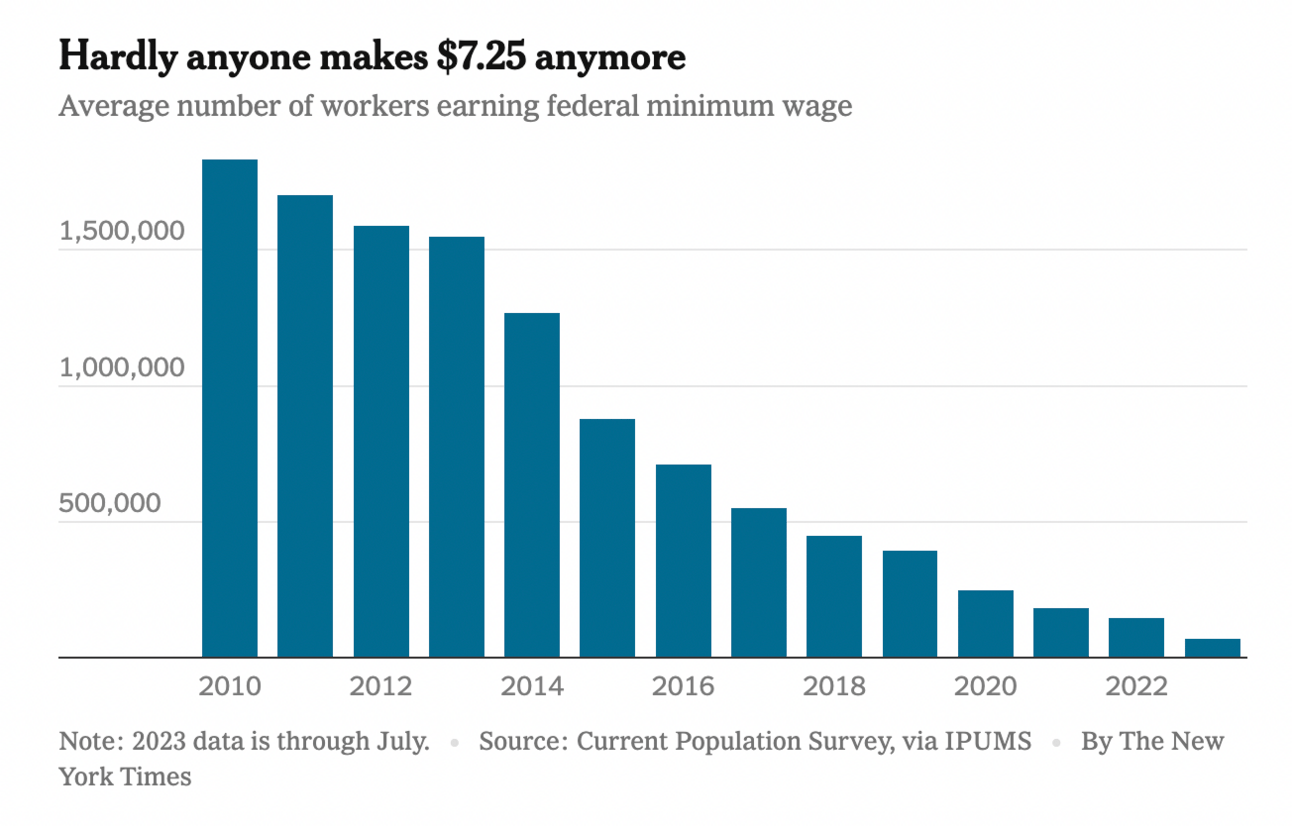 The hot labor market of the past two years has driven pay increases in service work, retail, hospitality, and other low-wage industries. By many measures, itβs also made the federal minimum wage meaningless.