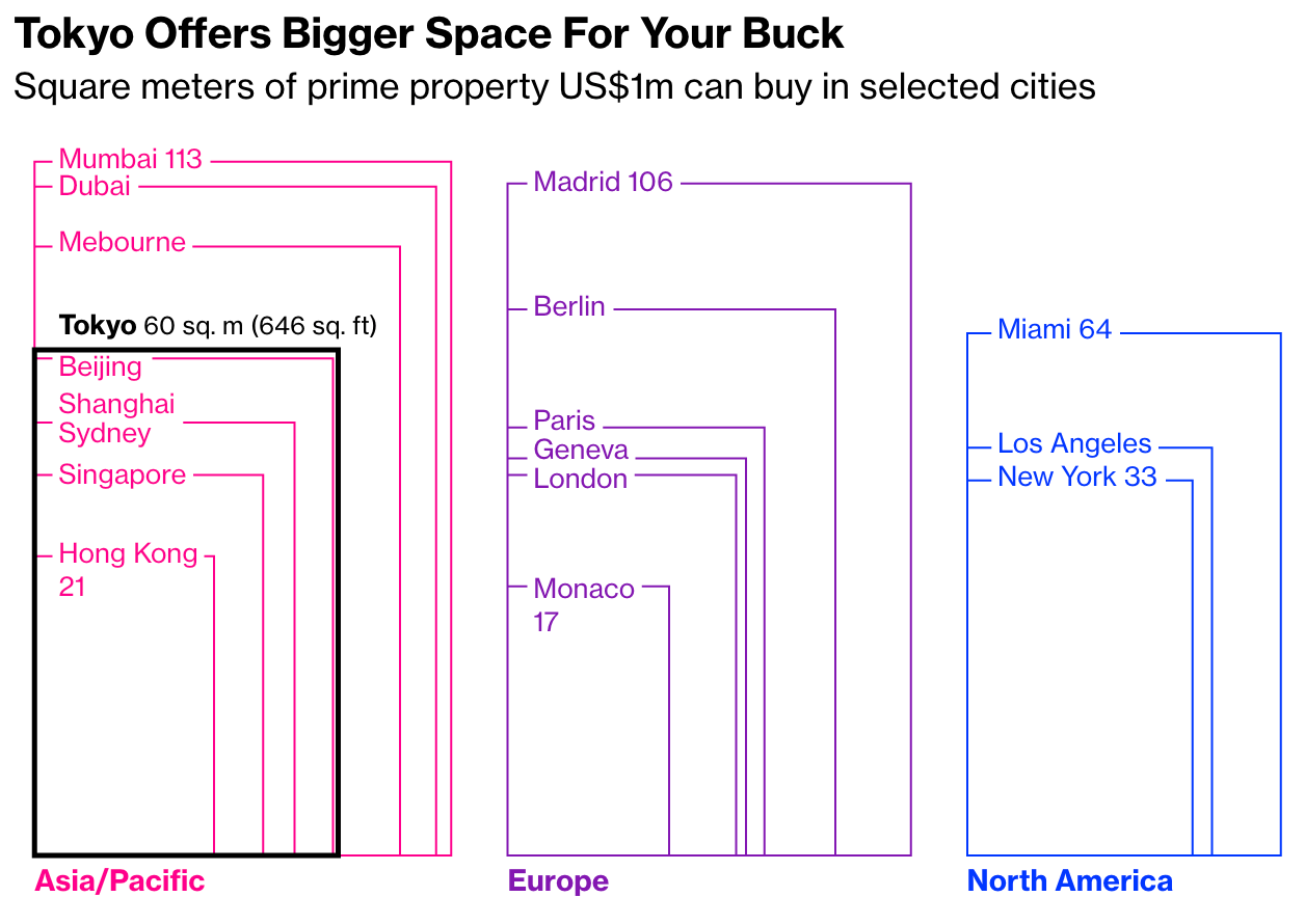 With a million dollars, a potential buyer can acquire twice the amount of prime real estate space in Tokyo than in other locations like New York, Los Angeles, London, or Paris.