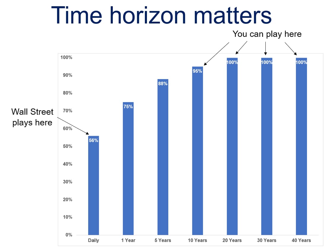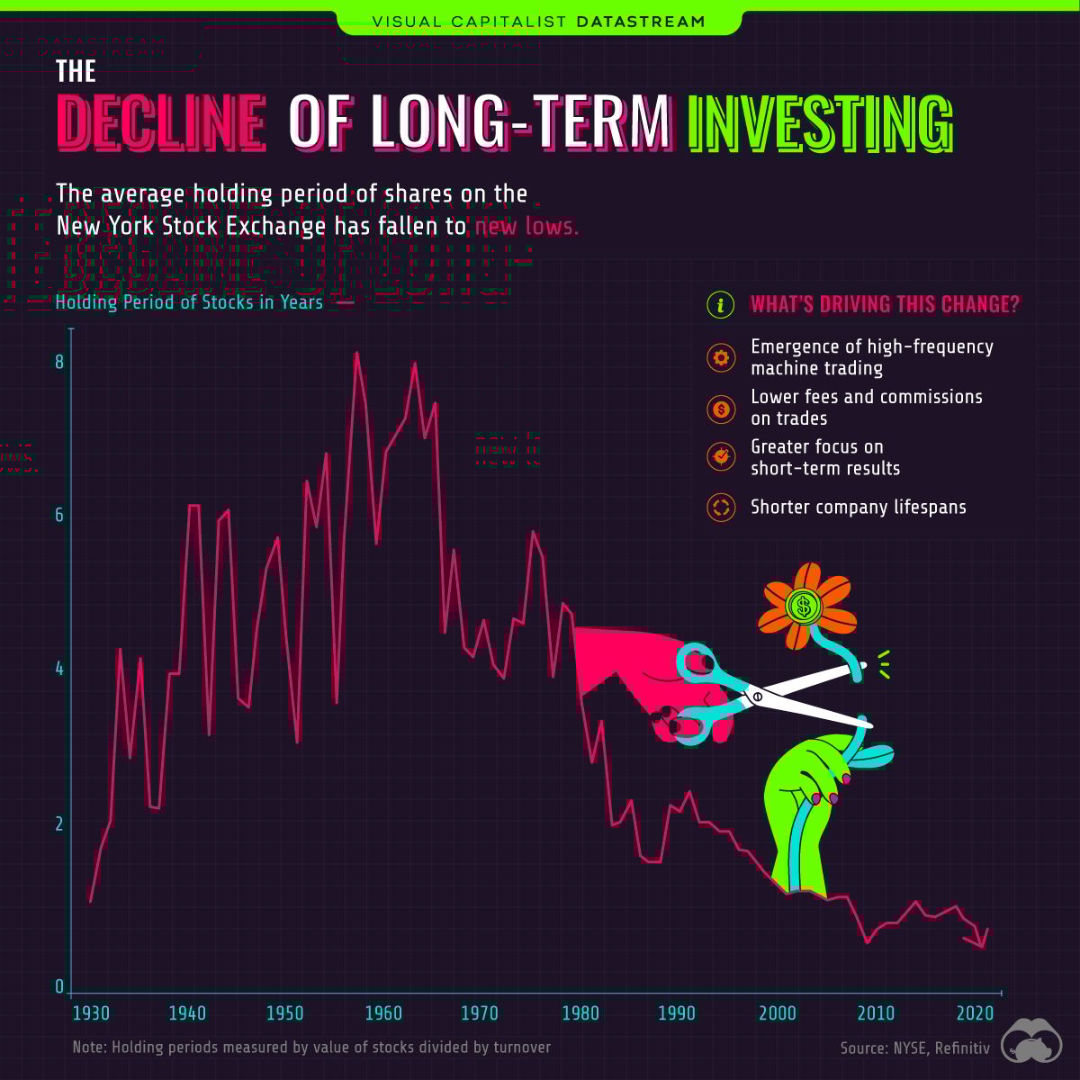 The average time horizon for individual and institutional investors has shortened drastically over the past few decades. In the 1980s and 1990s, many institutional investors β particularly pension funds β adopted long-term strategies. In the 1970s, the average holding period for stocks in the U.S. was about seven years. Yet a gradual, big shift has occurred: The average holding period has fallen to about six months today.