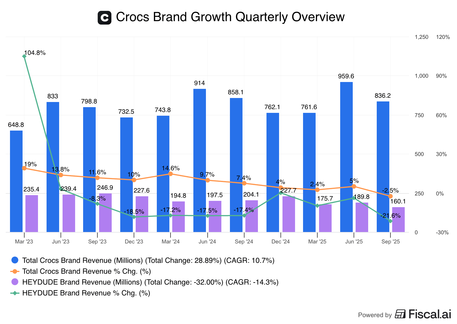 Second, sales are declining, and declining sales are never a good sign (these are the elite insights youâre subscribed for, right?). The key nuance, though, is where the decline is happening. Last quarter, revenue fell 6%, but almost all of that came from HeyDude, which was down roughly 20%. The Crocs core brand is more stable. Declines are very modest, despite pressure from reduced marketing to protect margins. International sales are still very strong.