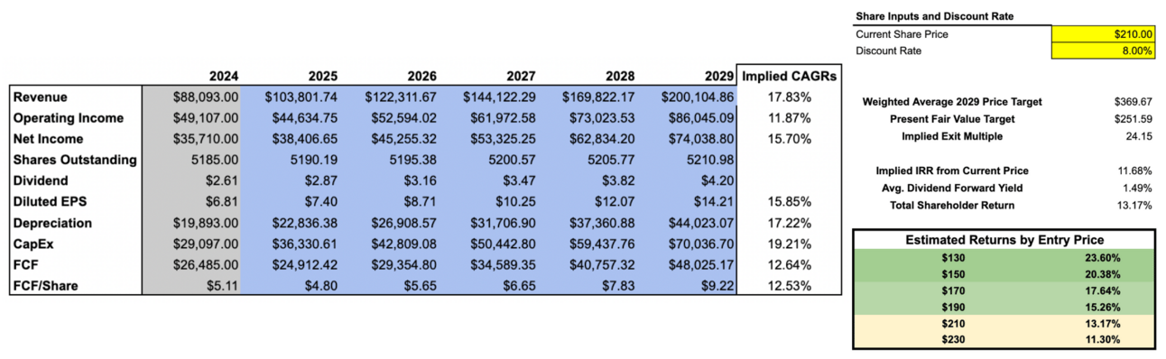Using an 8β―% discount rate and an exit multiple of 24Γ earnings, which is above todayβs level, but still a significant discount to peers and more than reasoanble for a company generating $40 billion in operating profit with 20% annual growth, I arrive at a fair present value of around $250 per share.
