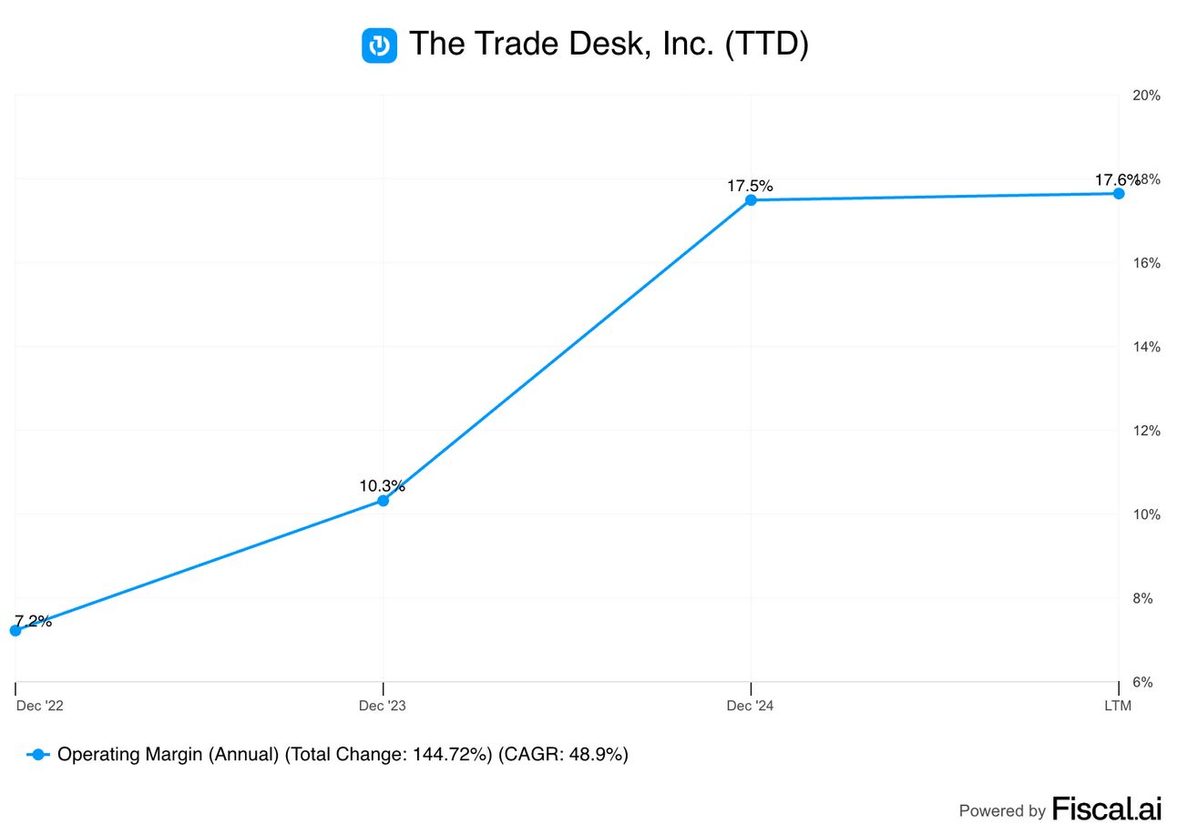 Again, TTD relies on algorithms to drive optimal ad spending, so thereβs very meaningful operating leverage. R&D, software infrastructure, and G&A costs donβt scale linearly with revenue, which means margins can expand over time as the business grows.