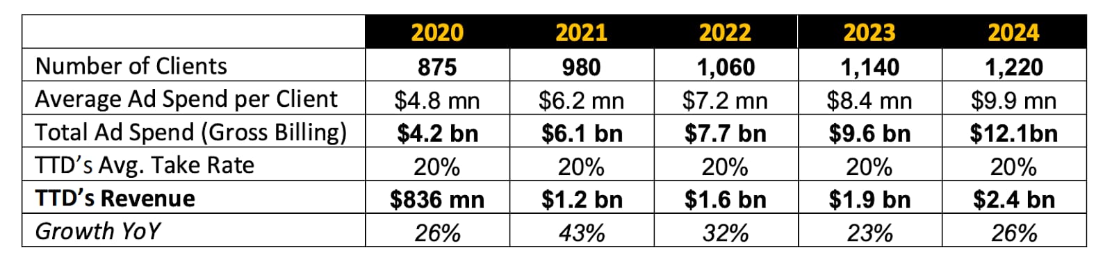 Thatβs where The Trade Desk has come in and built a business that has compounded revenues at an average rate of 50% a year for a decade(!), and closer to 30% in the last 5 years.