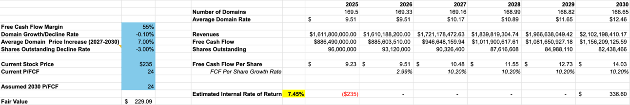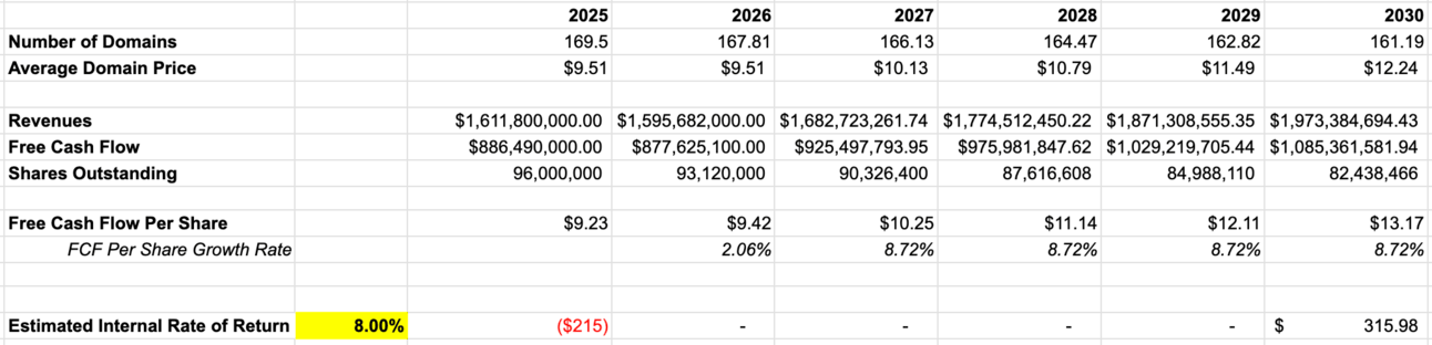 Assumes a 3% decline in shares outstanding, price hikes of around 7% starting in 2027, and a decline in total domains of -1% per year. Still equals roughly an 8% expected return from current prices