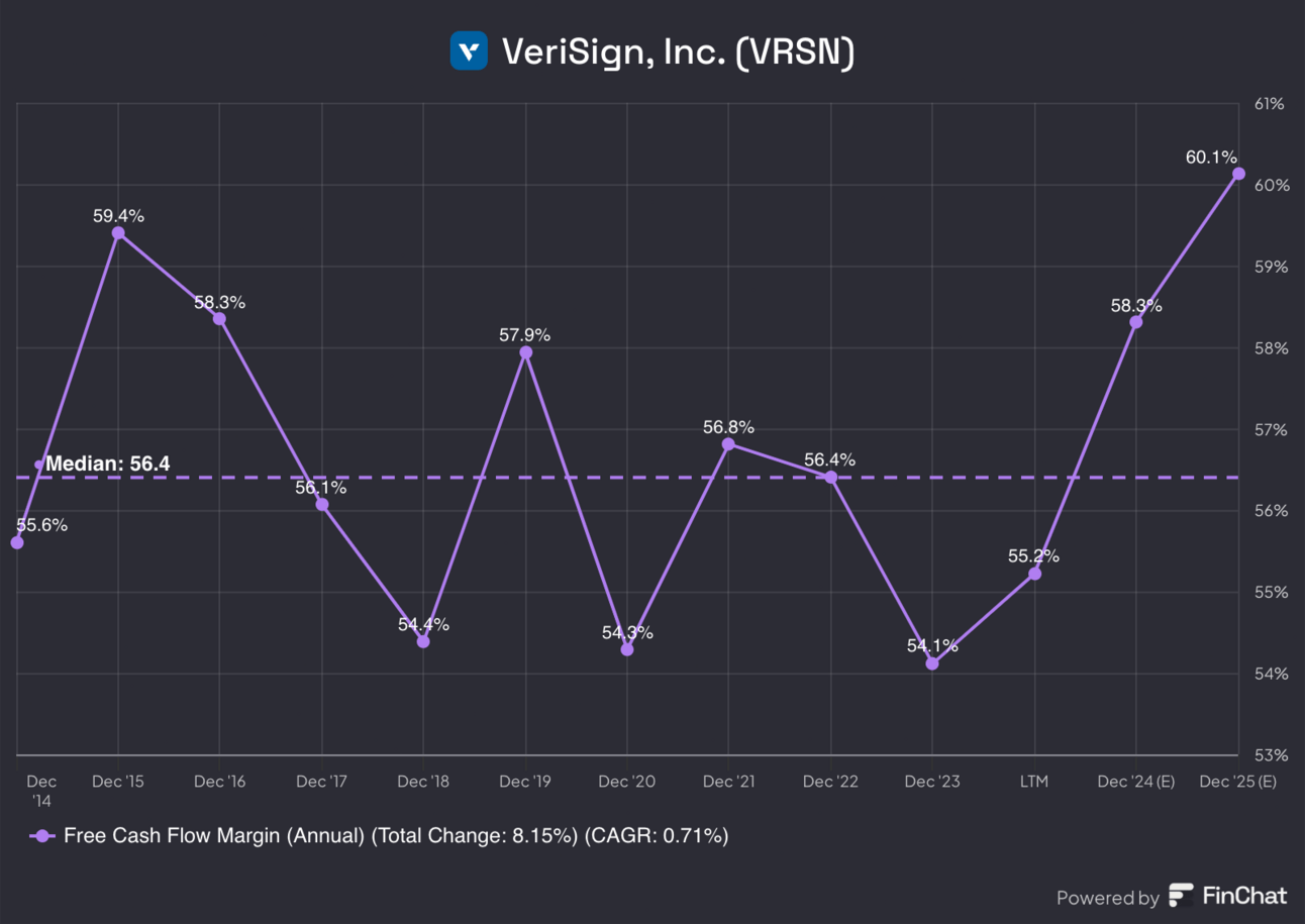 Correspondingly, VeriSign touts an eye-watering 55% free cash flow margin that has remained steady for at least the last decade, meaning that 55 cents from every dollar of revenue becomes free cash flow.