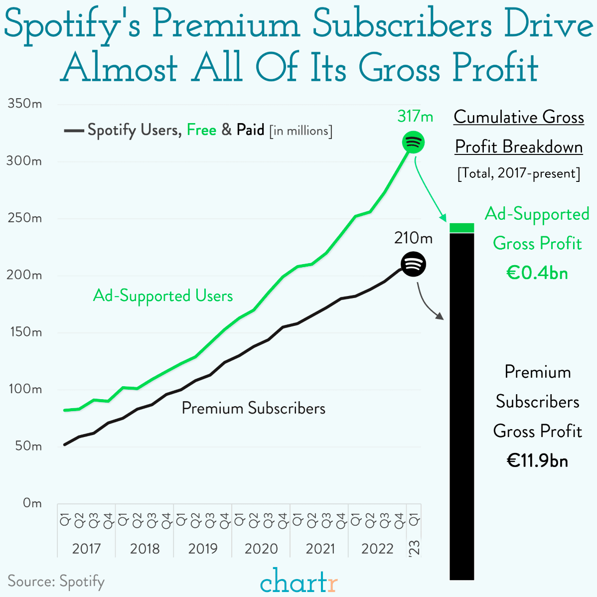 As the chart shows, Spotify has many free users who listen to advertisements, but premium subscribers drive nearly all of its profit. Still, the company has prioritized investment in growth over profit for years.